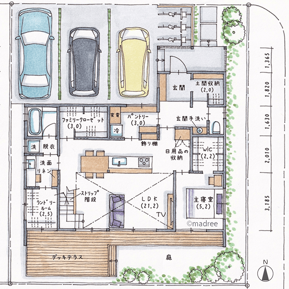 全国の建築家から間取りが集まるmadree(マドリー)で集まった36坪、3LDKの間取りです。外とつながるLDKやアウトドアリビングが特徴の注文住宅の間取りです。