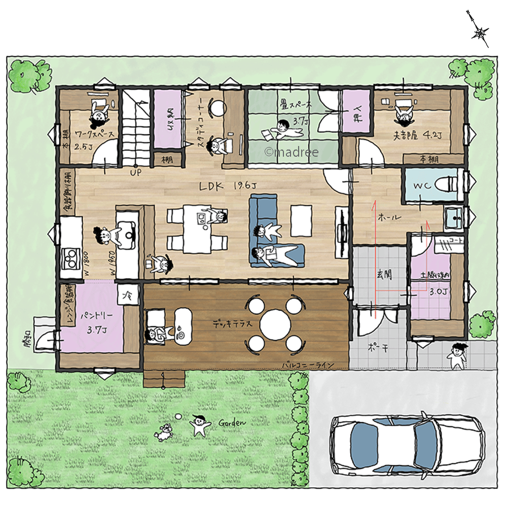 全国の建築家から間取りが集まるmadree(マドリー)で集まった47坪、2LDKの間取りです。外とつながるLDKやアウトドアリビングが特徴の注文住宅の間取りです。