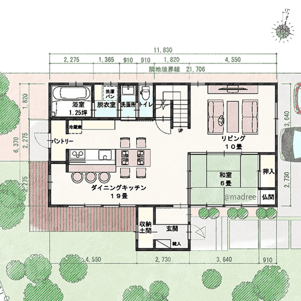 全国の建築家から間取りが集まるmadree(マドリー)で集まった38坪、3LDKの間取りです。外とつながるLDKや広く感じるLDKが特徴の注文住宅の間取りです。