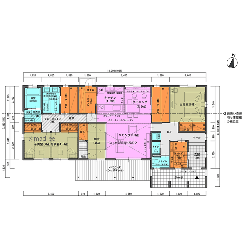 ・リビングは屋根勾配に合わせた斜め天井の吹抜空間です。段違い変形切り妻屋根の北側屋根との隙間に高窓を設置し、リビング吹抜の採光・通風に用います。窓の開閉・メンテはキャットウォーク(吹抜通路)から容易に行えます。