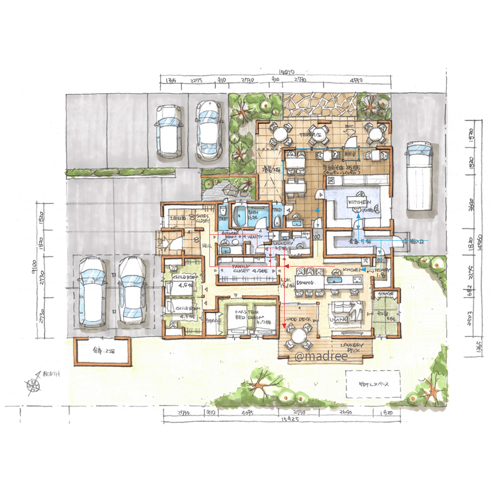全国の建築家から間取りが集まるmadree(マドリー)で集まった48坪、3LDKの間取りです。外とつながるLDKやアウトドアリビングが特徴の注文住宅の間取りです。