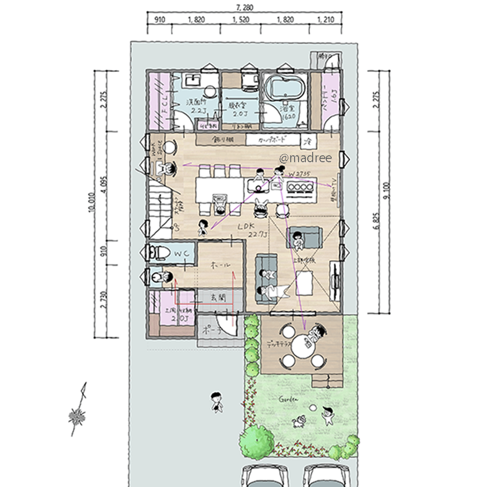 全国の建築家から間取りが集まるmadree(マドリー)で集まった35坪、2LDKの間取りです。外とつながるLDKやアウトドアリビングが特徴の注文住宅の間取りです。