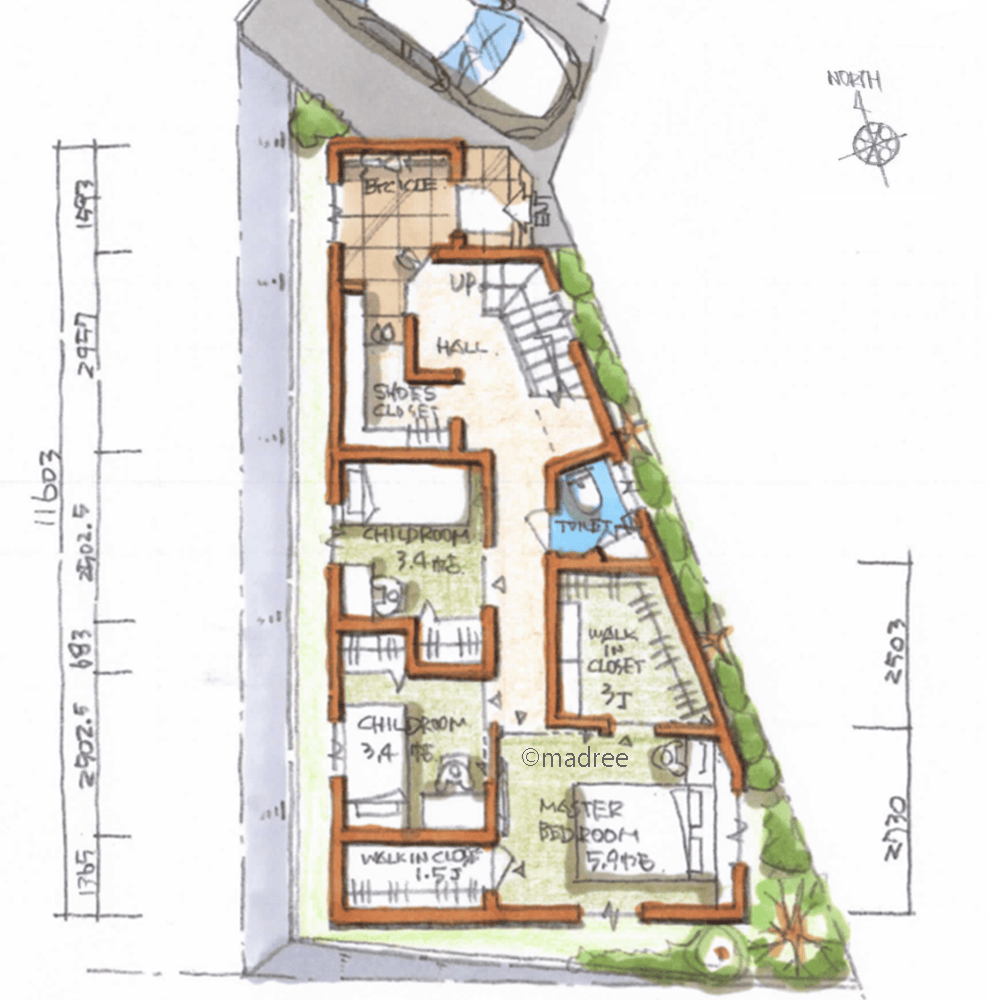 全国の建築家から間取りが集まるmadree(マドリー)で集まった27坪〜30坪、3LDKの間取りです。外とつながるLDKや2階リビングが特徴の注文住宅の間取りです。