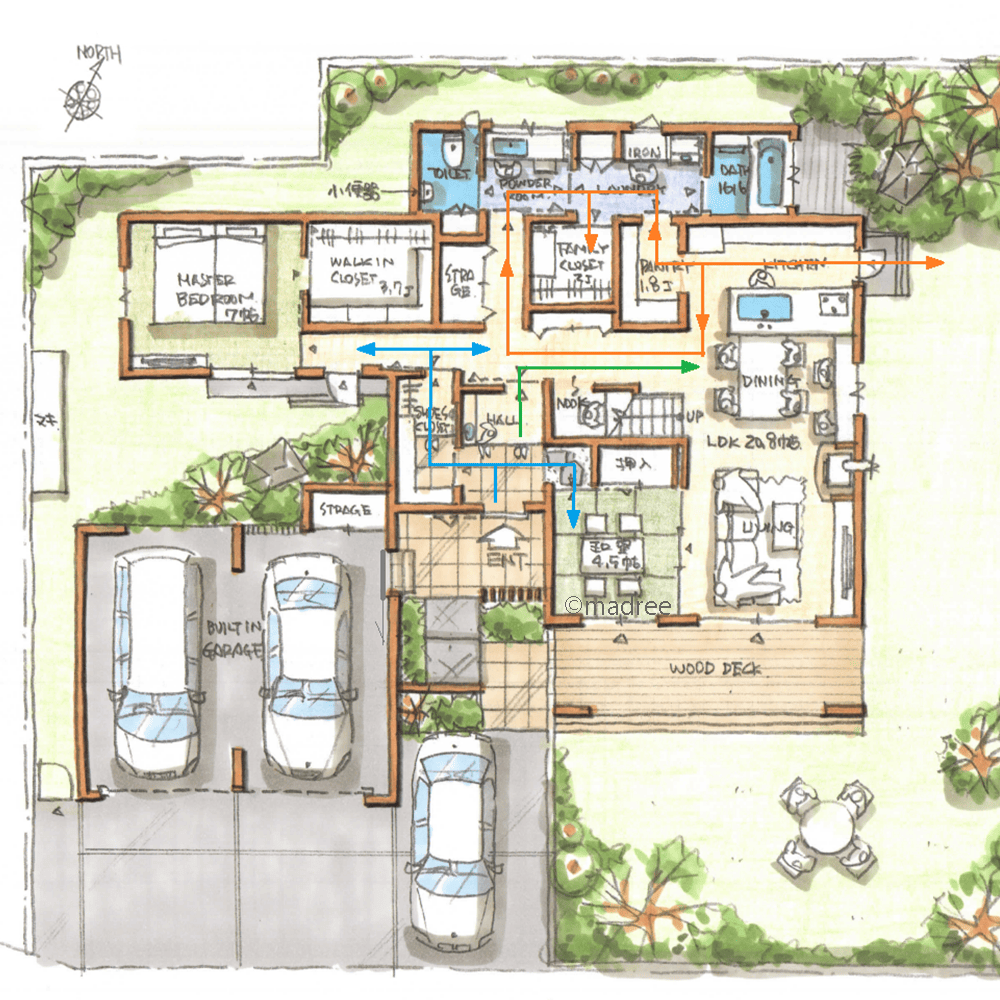 全国の建築家から間取りが集まるmadree(マドリー)で集まった41坪、3LDKの間取りです。外とつながるLDKやリビング吹抜が特徴の注文住宅の間取りです。