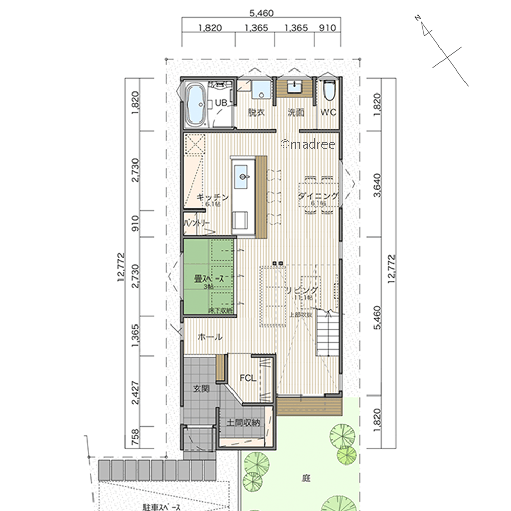 全国の建築家から間取りが集まるmadree(マドリー)で集まった35坪、3LDKの間取りです。外とつながるLDKやアウトドアリビングが特徴の注文住宅の間取りです。