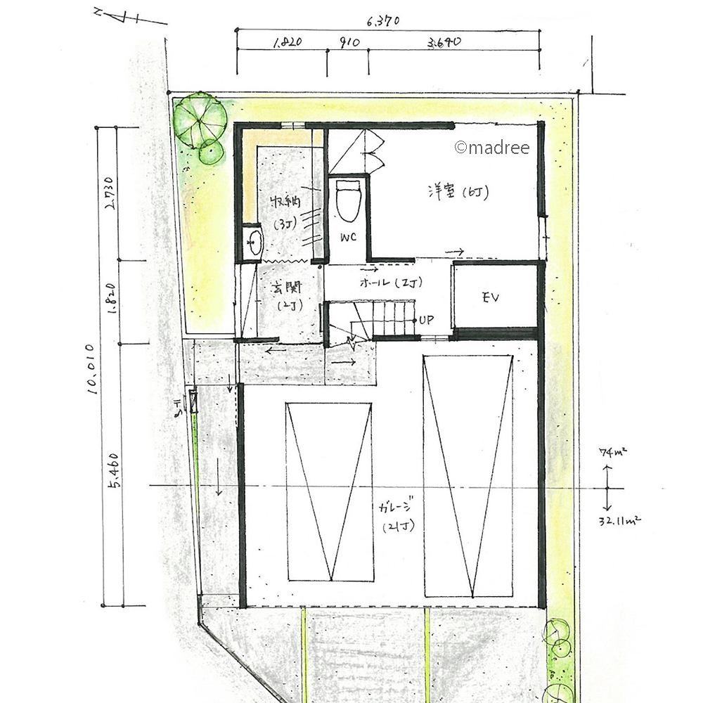 全国の建築家から間取りが集まるmadree(マドリー)で集まった31坪、3LDKの間取りです。外とつながるLDKや2階リビングが特徴の注文住宅の間取りです。
