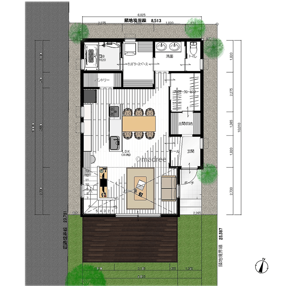 全国の建築家から間取りが集まるmadree(マドリー)で集まった35坪、2LDKの間取りです。外とつながるLDKやアウトドアリビングが特徴の注文住宅の間取りです。