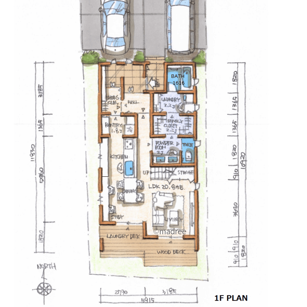 全国の建築家から間取りが集まるmadree(マドリー)で集まった33坪、4LDKの間取りです。外とつながるLDKやアウトドアリビングが特徴の注文住宅の間取りです。