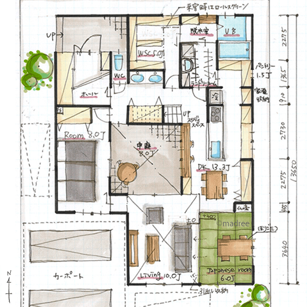・中庭:玄関、リビング、ダイニング、和室、寝室と様々な方向と繋げ、各部屋に開放感と一体感を生み出します。