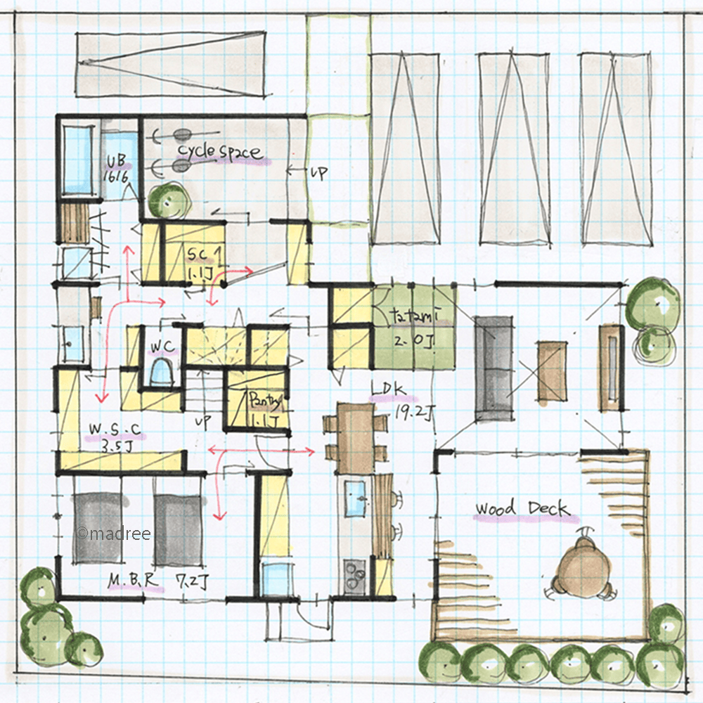 全国の建築家から間取りが集まるmadree(マドリー)で集まった36坪、4LDKの間取りです。外とつながるLDKやアウトドアリビングが特徴の注文住宅の間取りです。