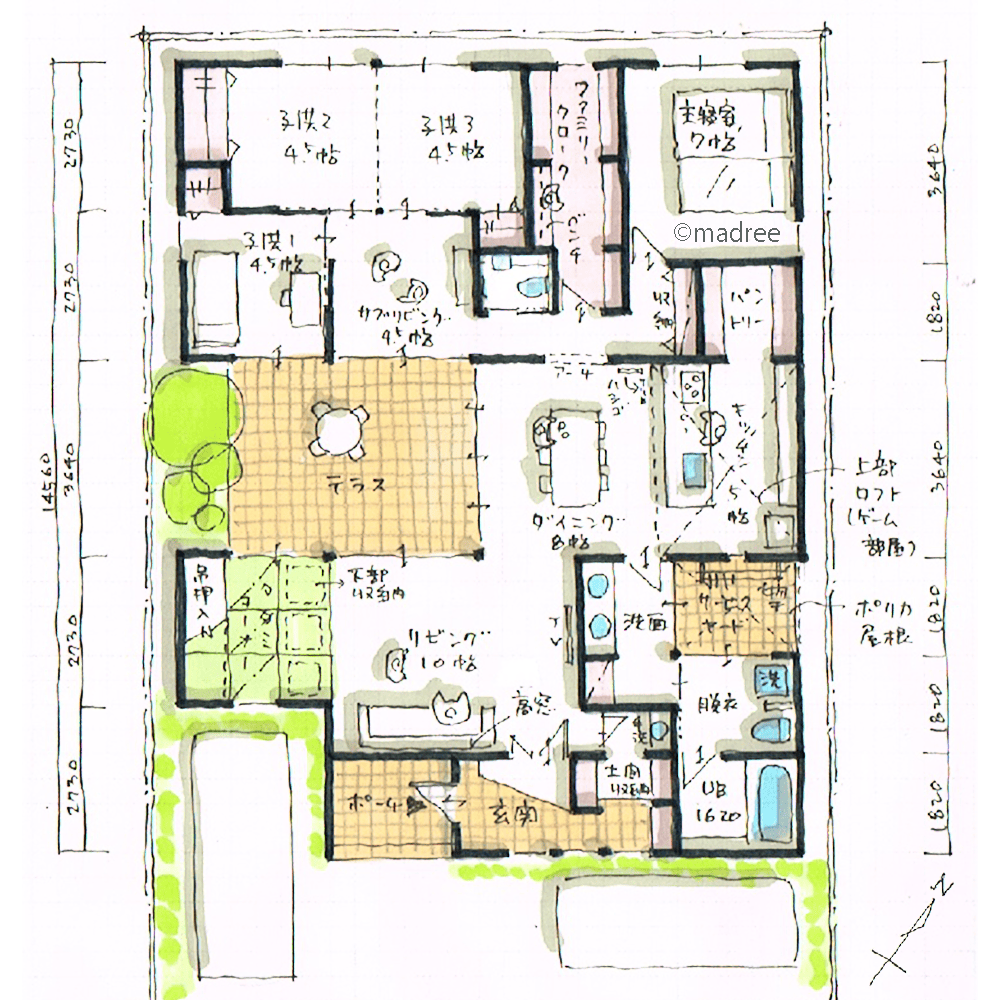 全国の建築家から間取りが集まるmadree(マドリー)で集まった40坪、3LDKの間取りです。外とつながるLDKやアウトドアリビングが特徴の注文住宅の間取りです。