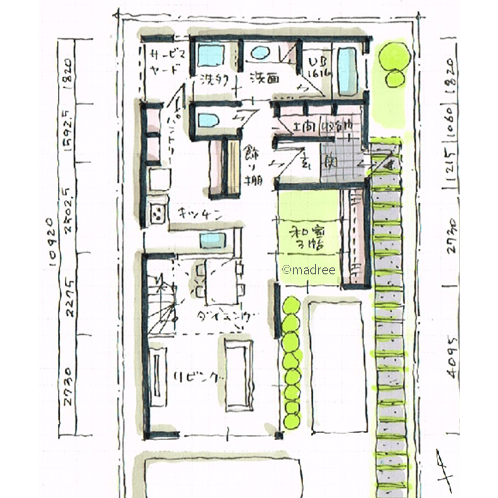 全国の建築家から間取りが集まるmadree(マドリー)で集まった27坪〜30坪、5LDKの間取りです。外とつながるLDKやダイニング吹抜が特徴の注文住宅の間取りです。