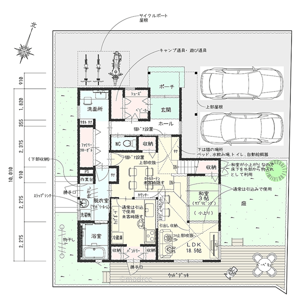 全国の建築家から間取りが集まるmadree(マドリー)で集まった36坪、3LDKの間取りです。外とつながるLDKやアウトドアリビングが特徴の注文住宅の間取りです。