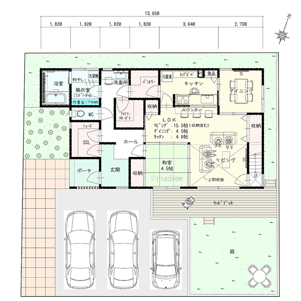 全国の建築家から間取りが集まるmadree(マドリー)で集まった44坪、4LDKの間取りです。外とつながるLDKやアウトドアリビングが特徴の注文住宅の間取りです。
