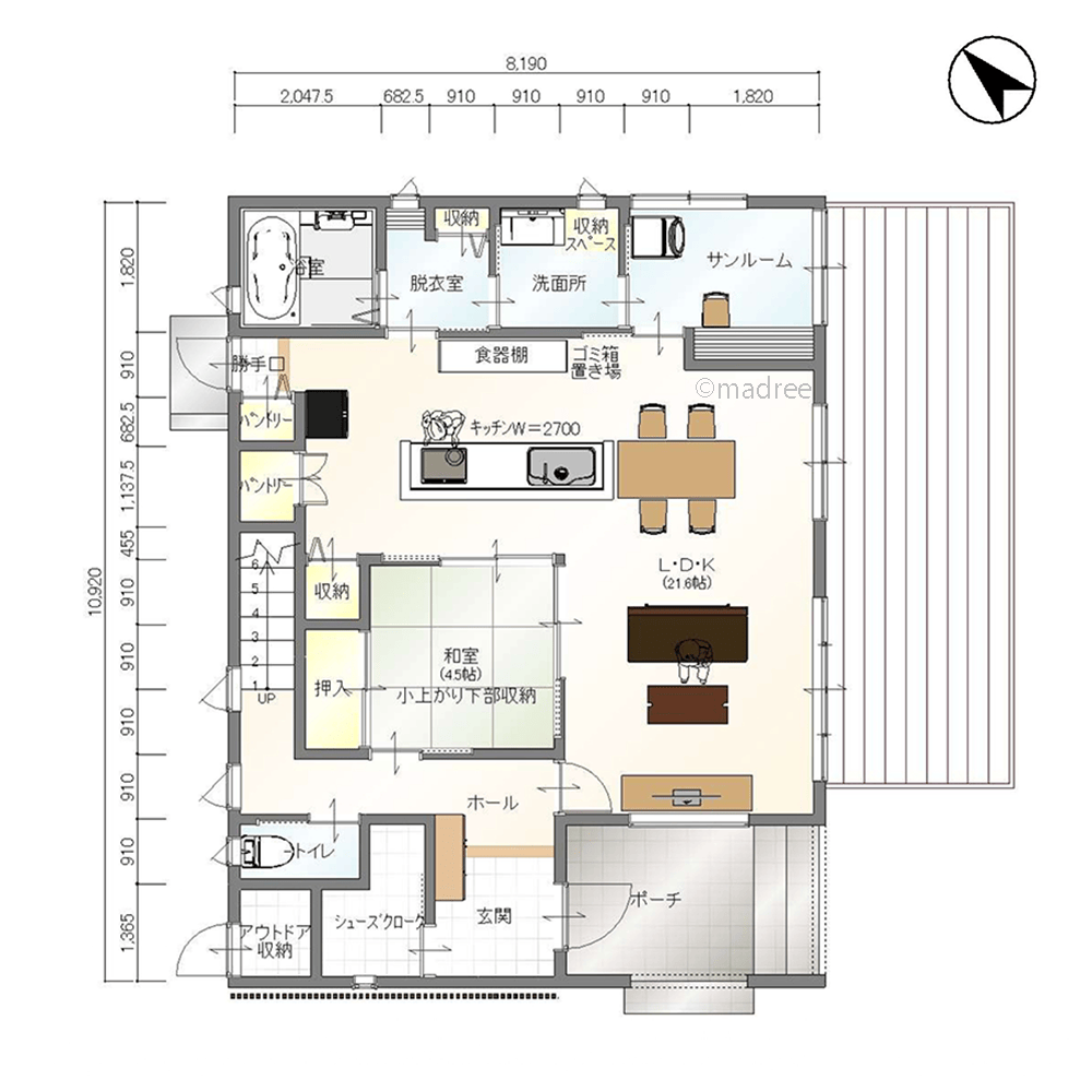 ・家事動線を考慮し、水廻りやサンルームへ行きやすくしました。