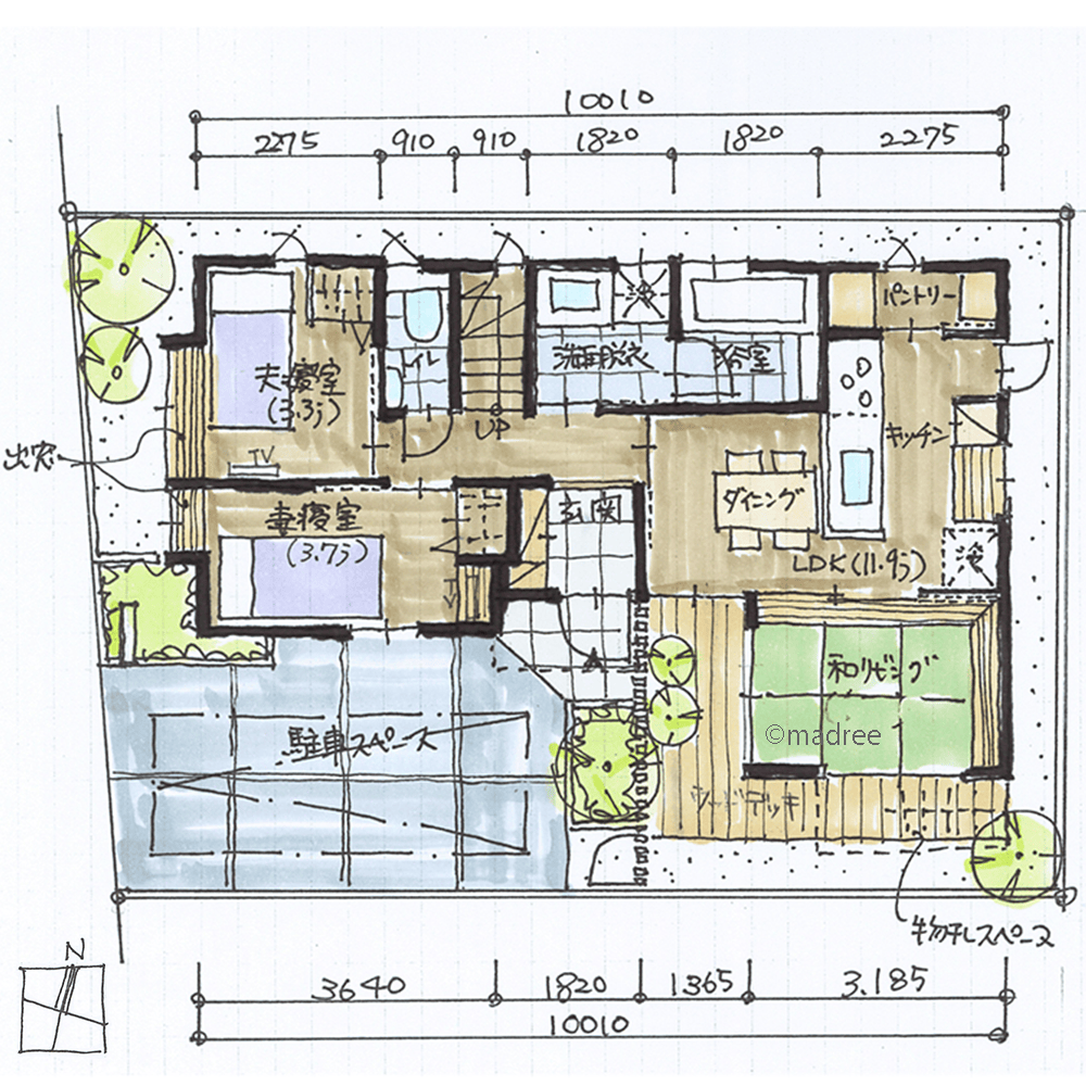 全国の建築家から間取りが集まるmadree(マドリー)で集まった27坪〜30坪、4LDKの間取りです。外とつながるLDKやアウトドアリビングが特徴の注文住宅の間取りです。