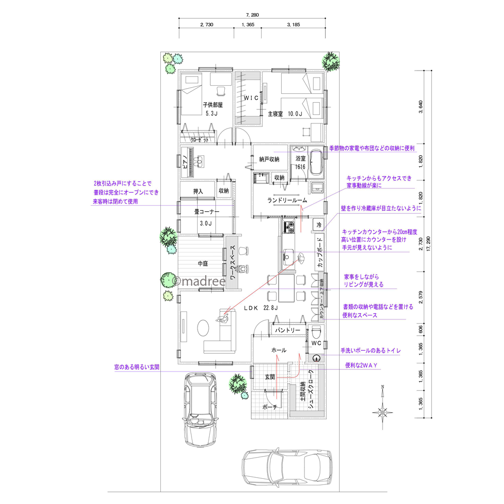 全国の建築家から間取りが集まるmadree(マドリー)で集まった32坪、2LDKの間取りです。外とつながるLDKや広く感じるLDKが特徴の注文住宅の間取りです。