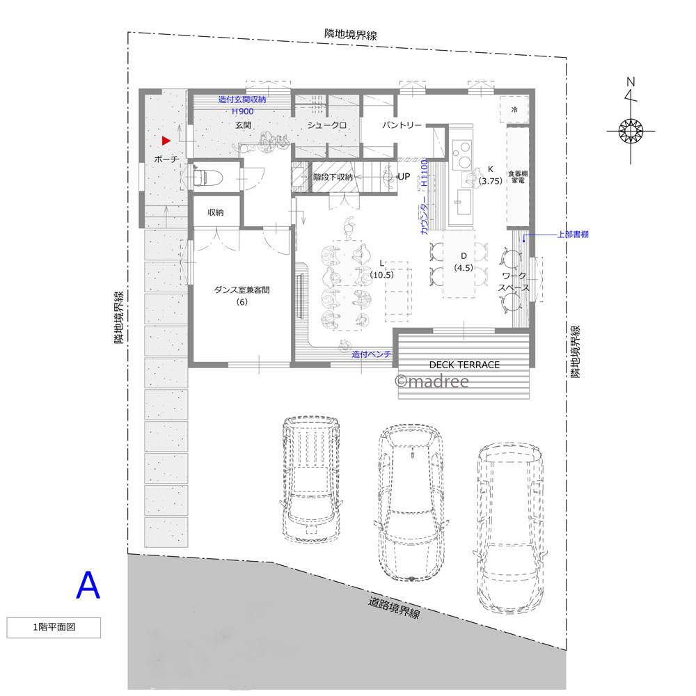 全国の建築家から間取りが集まるmadree(マドリー)で集まった37坪、3LDKの間取りです。外とつながるLDKやリビング中心の動線が特徴の注文住宅の間取りです。