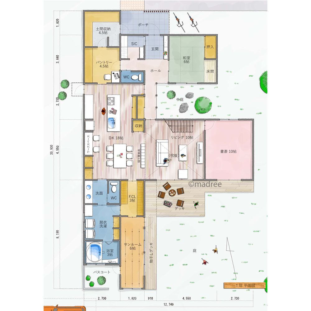 全国の建築家から間取りが集まるmadree(マドリー)で集まった66坪、6LDKの間取りです。花粉症対策や外とつながるLDKが特徴の注文住宅の間取りです。