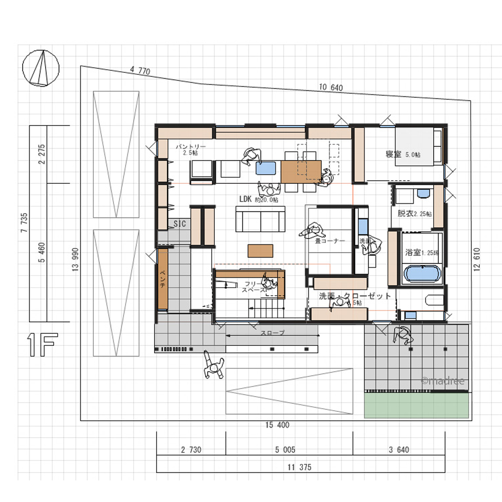 全国の建築家から間取りが集まるmadree(マドリー)で集まった36坪、3LDKの間取りです。リビング中心の動線やリビング一体の畳が特徴の注文住宅の間取りです。