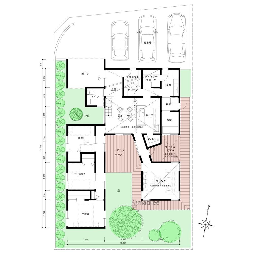 全国の建築家から間取りが集まるmadree(マドリー)で集まった31坪、3LDKの間取りです。外とつながるLDKやアウトドアリビングが特徴の注文住宅の間取りです。