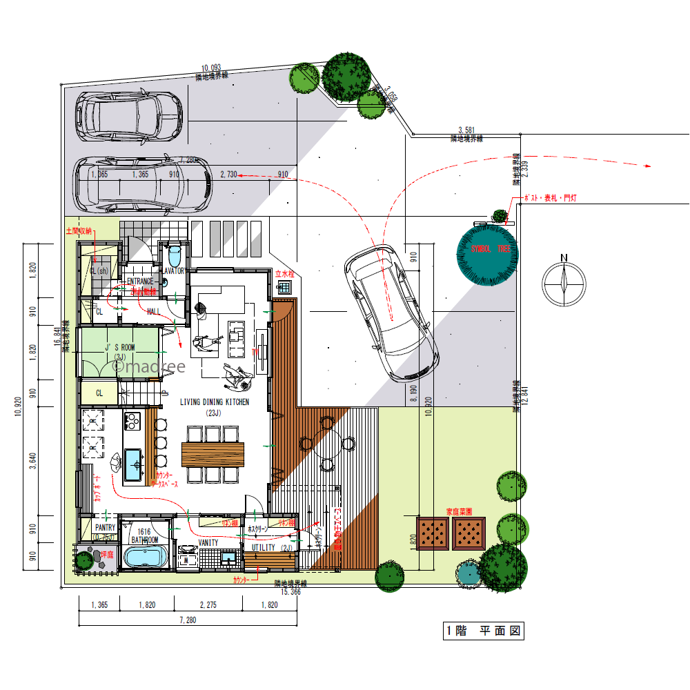 ・入り口の狭い駐車場は、頭から入り切り返して建物北側に止めるように考えました。