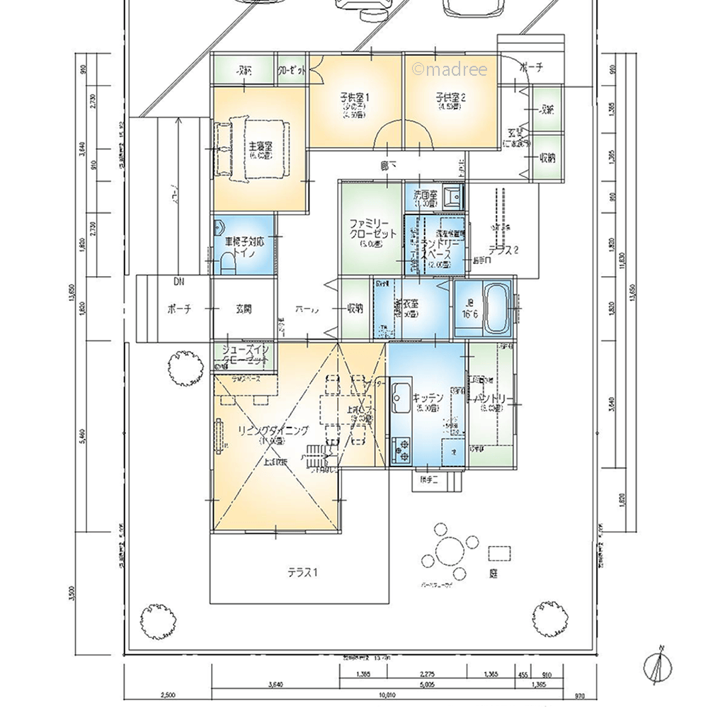 全国の建築家から間取りが集まるmadree(マドリー)で集まった33坪、3LDKの間取りです。外とつながるLDKやリビング吹抜が特徴の注文住宅の間取りです。