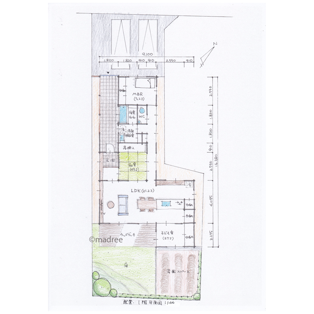 全国の建築家から間取りが集まるmadree(マドリー)で集まった26坪、3LDKの間取りです。外とつながるLDKやアウトドアリビングが特徴の注文住宅の間取りです。