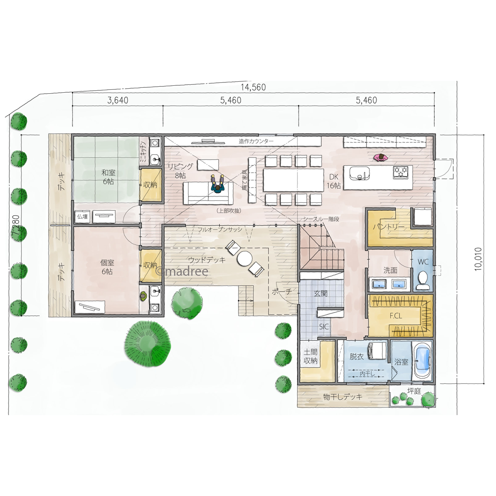 全国の建築家から間取りが集まるmadree(マドリー)で集まった47坪、5LDKの間取りです。外とつながるLDKやアウトドアリビングが特徴の注文住宅の間取りです。