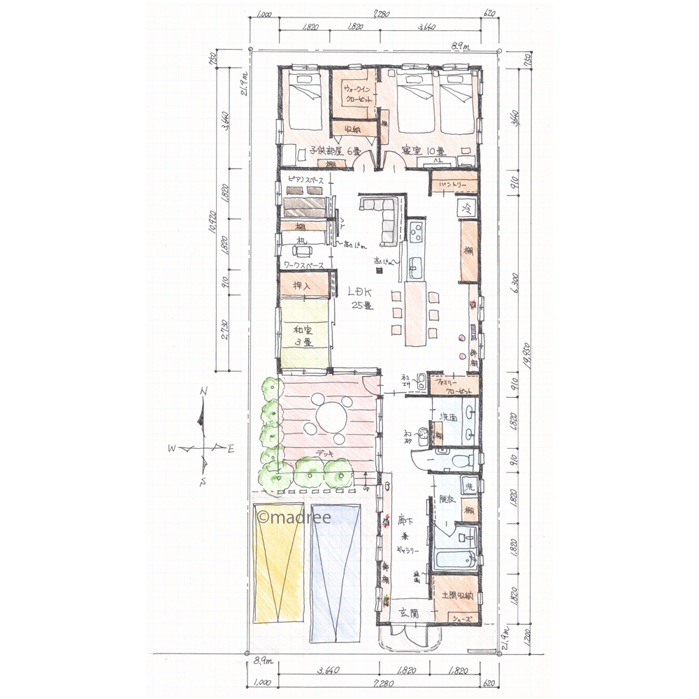 全国の建築家から間取りが集まるmadree(マドリー)で集まった34坪、3LDKの間取りです。外とつながるLDKやアウトドアリビングが特徴の注文住宅の間取りです。