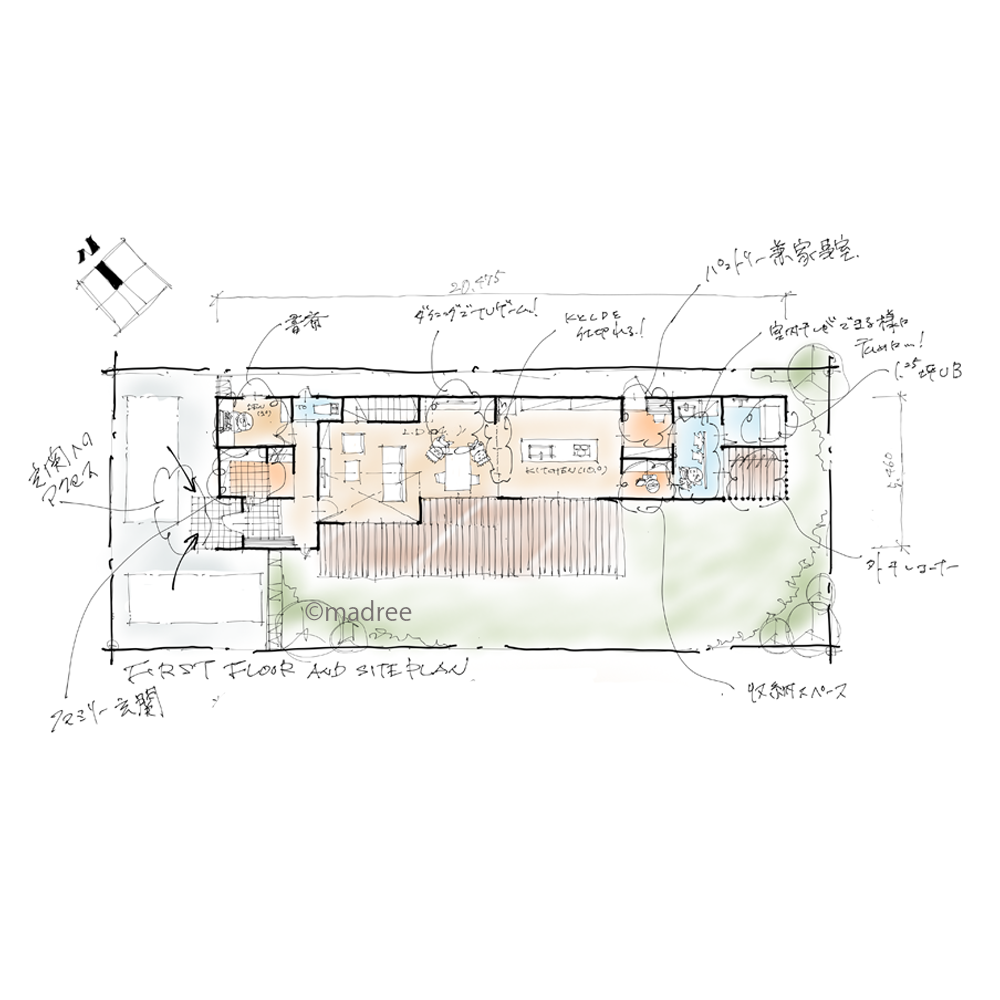 ・南側に多く面するように計画しておりますので、東西に長い建物となっております。キッチンとLDの配置を逆に、という考え方もあると思いますが、来客時にいきなりキッチンに入るのは避けたい、と個人的に考えております。 充分明るさは確保できていると思います。
