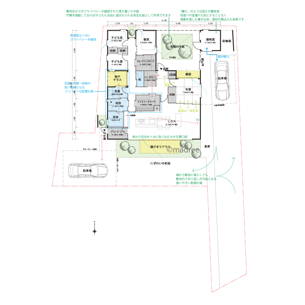 全国の建築家から間取りが集まるmadree(マドリー)で集まった33坪、5LDKの間取りです。外とつながるLDKや広く感じるLDKが特徴の注文住宅の間取りです。