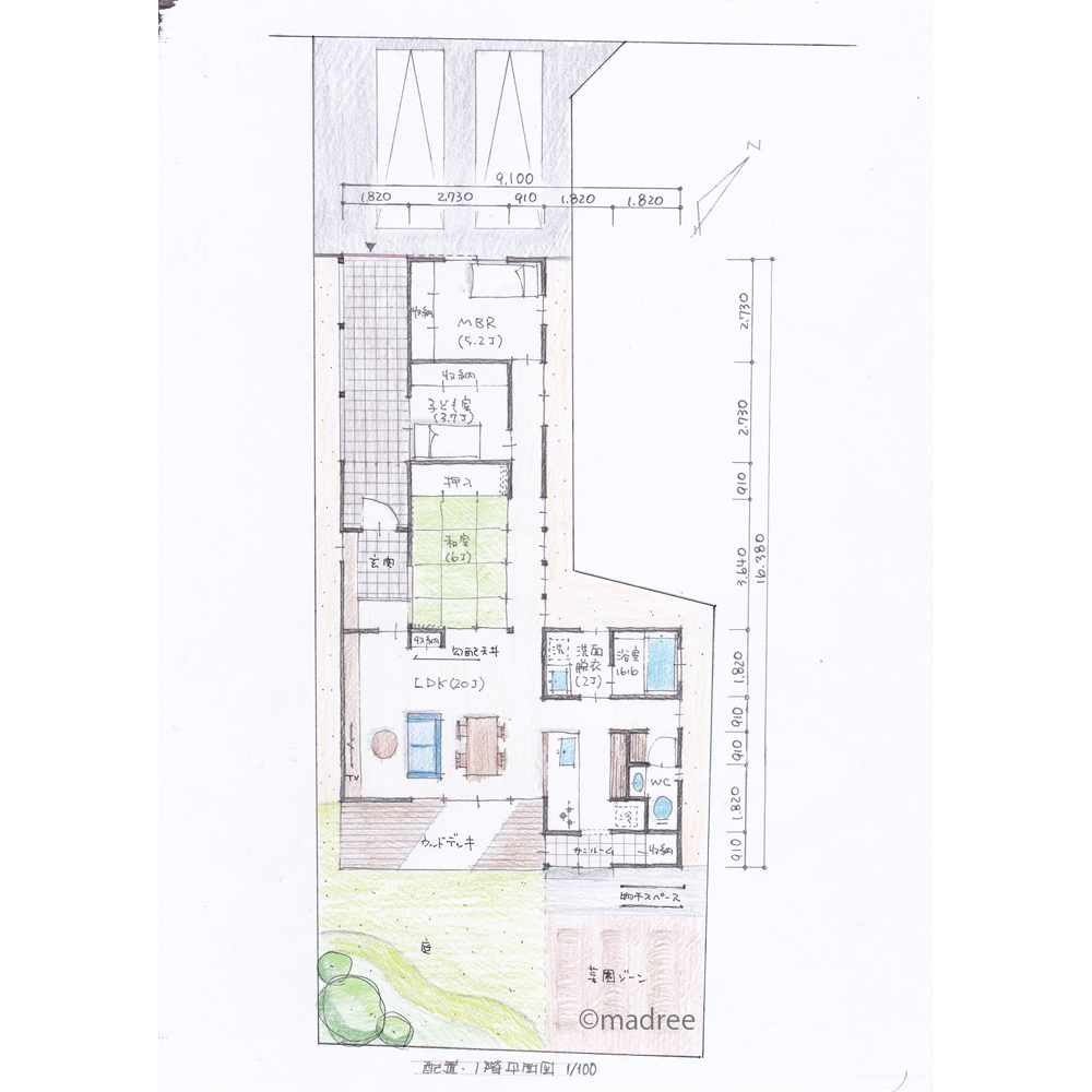 全国の建築家から間取りが集まるmadree(マドリー)で集まった27坪、3LDKの間取りです。外とつながるLDKやリビング中心の動線が特徴の注文住宅の間取りです。