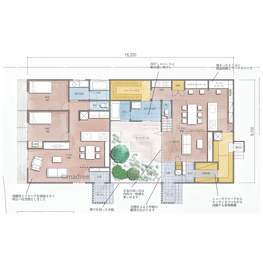 全国の建築家から間取りが集まるmadree(マドリー)で集まった55坪、パントリーの間取りです。外とつながるLDKやアウトドアリビングが特徴の注文住宅の間取りです。