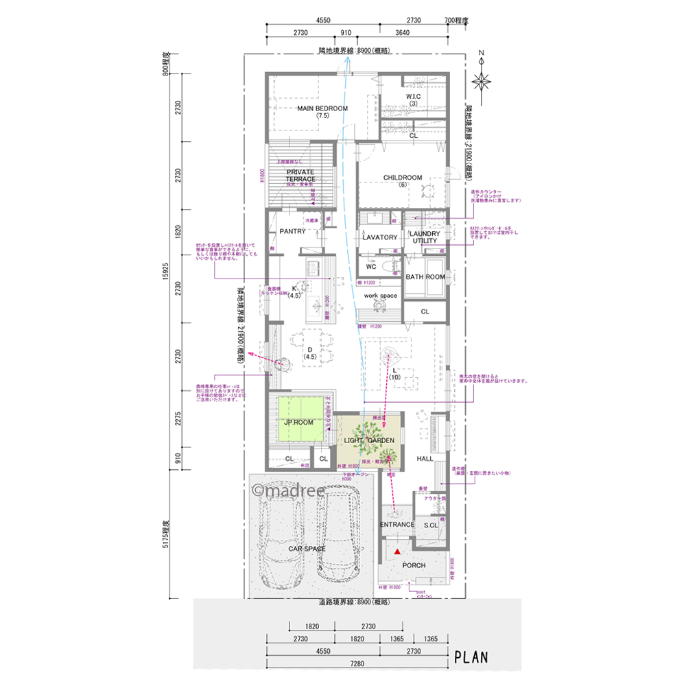 ・玄関の扉を開けると正面に坪庭的な光庭が見え、気持ちのいい玄関に感じられるよう視覚的効果も狙っています。また光庭は和室に配置する地窓からの眺めにも一役買う事でしょう。光庭は採光のための庭としてガレージに面している外壁の高さを1800として道路からの視線をカットし、通風のため壁の下部高さ300ミリメートルほどを開けることをお勧めします。