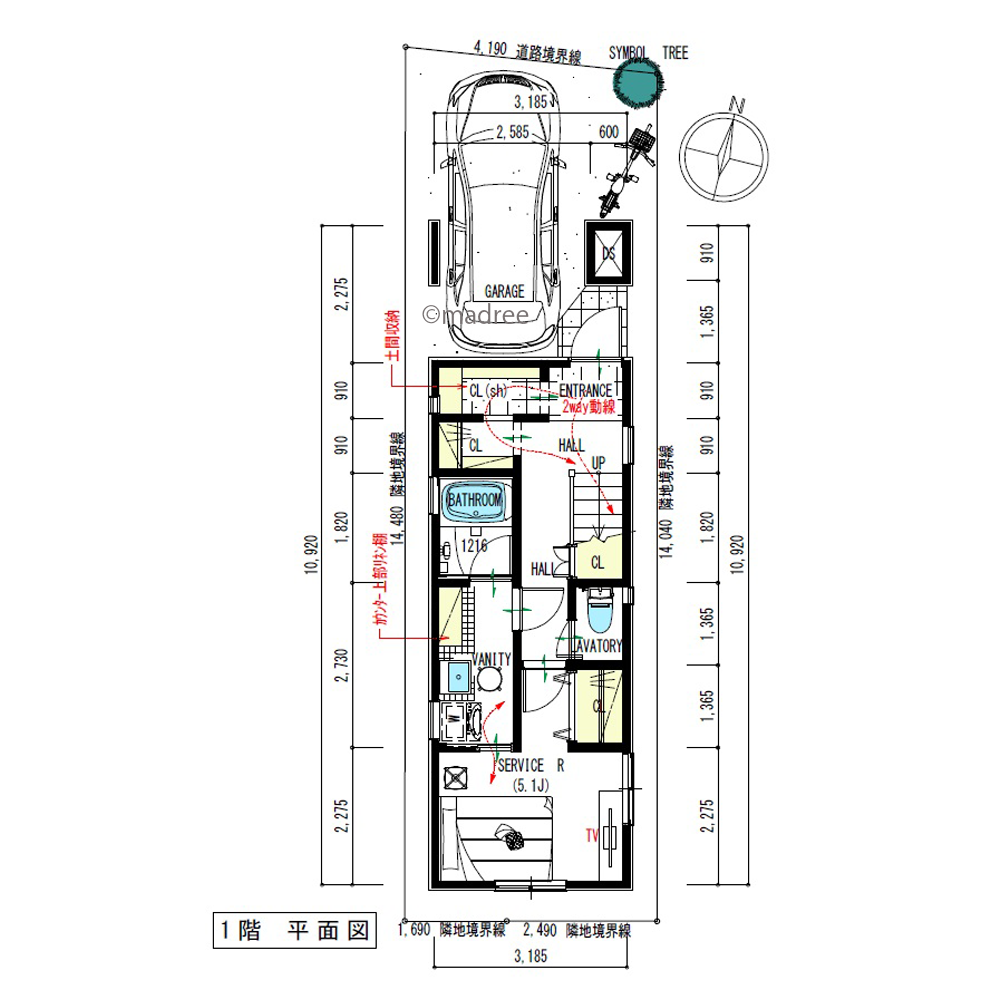 エントランス入って右側に、土間収納とクローゼットを配置して2way動線としました。土間収納の窓は西側になります。北側は極力構造壁を配置したいと思います。また1階へバスルームと洗面所を広めにとりまして、洗面所内へはタオル等のリネン棚を設け、洗面台も座って使えるようにしました。更に、主寝室と隣接するので、主寝室からの出入も出来る様に引き戸を設けております。
