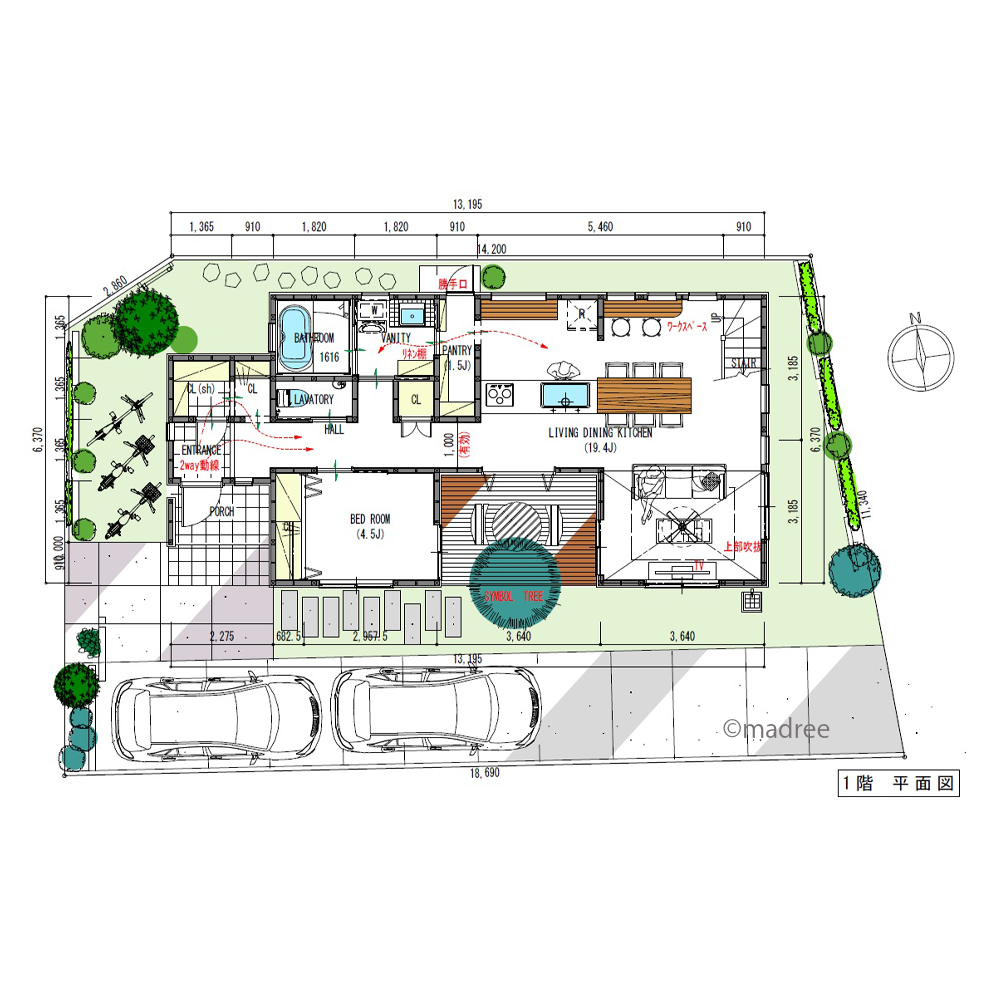 [36坪 4LDK] プライベート中庭で緑感じ、吹抜から光差し込むバリアフリーの家の間取り